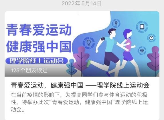 近日,共青团中央联合国家体育总局、全国学联下发通知,对面向大学生组织开展“青春爱运动,健康强中国”全民健身活动进行部署安排。理学院积极响应校团委号召,开展三个阶段的打卡挑战赛。第一期已经落下帷幕:经过六天的“平板支撑线上挑战赛”,比较单场累计支撑时长的方式开展平板支撑活动,激发了学生体育锻炼热情,倡导了健康科学的锻炼习惯。在第一阶段的活动中,理学院号召参赛同学于5月14日-5月18日内进行“平板支撑”...