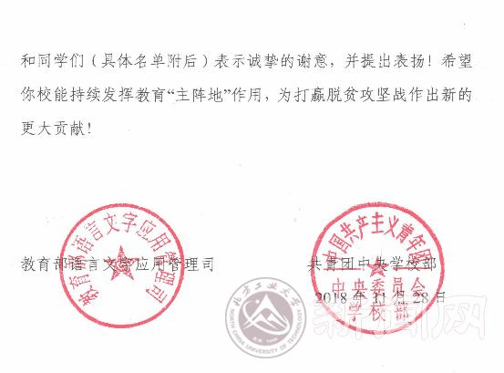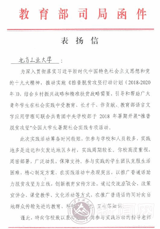 近日,学校收到教育部语言文字应用管理司和团中央学校部发来的表扬信,对必赢官网参加2018年“推普脱贫攻坚”全国大学生暑期社会实践的优秀团队提出表扬。