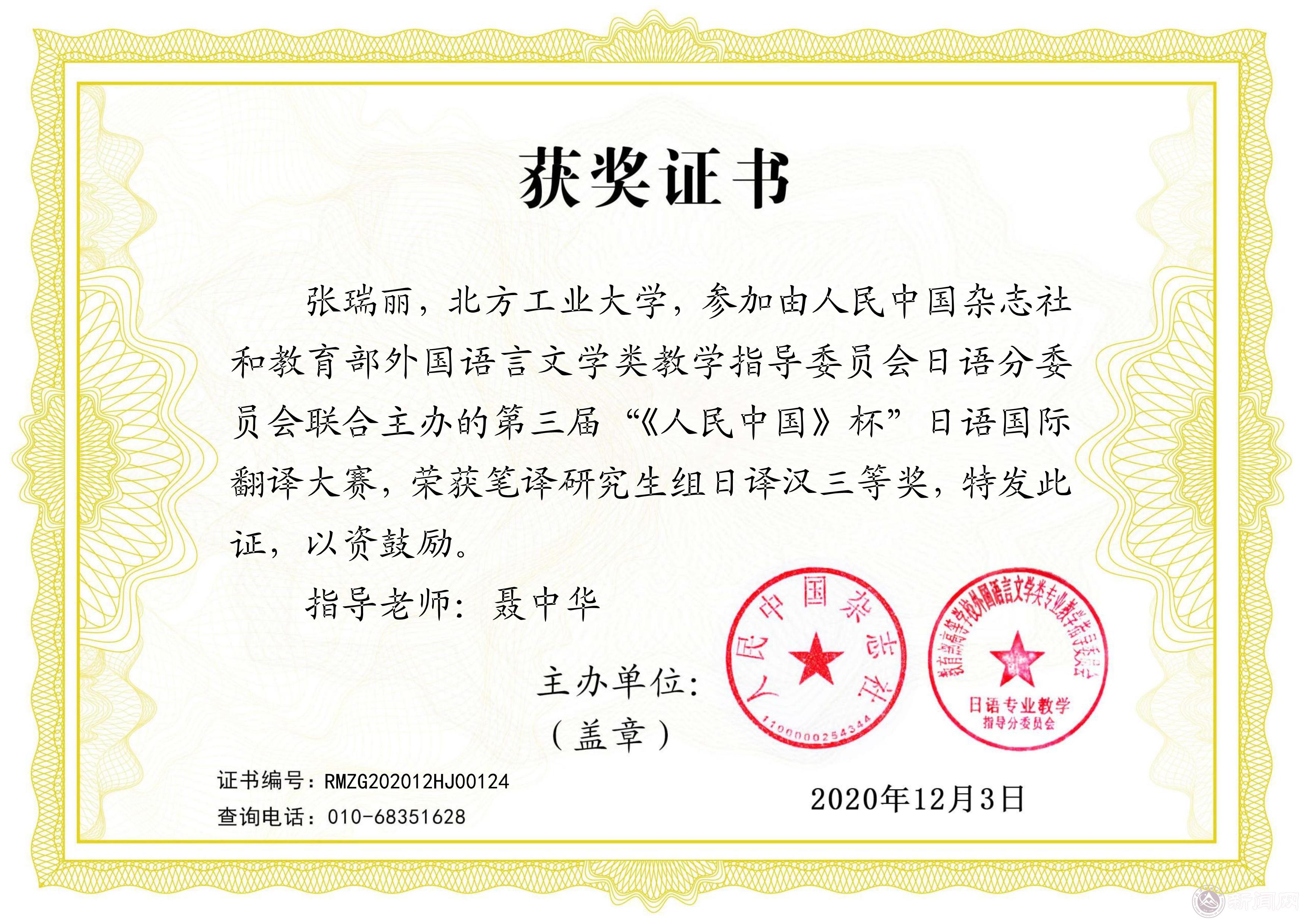 日语国际翻译大赛由中国外文局旗下人民中国杂志社与教育部外国语言文学类教学指导委员会日语分委会联合主办,由广东省翻译协会和广州市联普翻译有限公司共同承办。大赛分为笔译赛和口译赛,其中笔译赛分设汉译日和日译汉两类项目,参赛选手不分国籍、年龄,共有来自中国和日本的500多所高校及众多企业的近4000名选手参加。经过紧张的选拔、评比和严格审核,张瑞丽同学以优异的成绩突围,摘得三等奖。