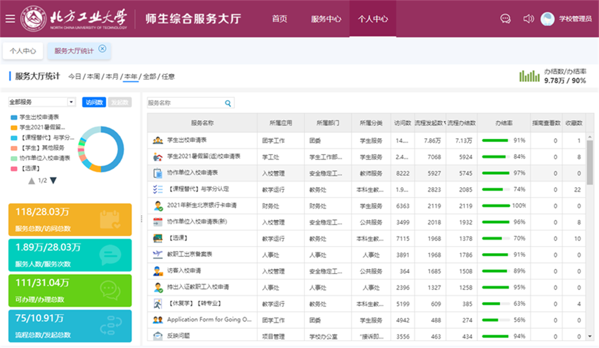 网信中心以方便师生为宗旨,统筹全校各业务部门需求,梳理和优化学校主要业务流程,融合业务与数据,推进数字资源服务云平台的建设,部署优化了校园WebVPN平台和统一身份认证平台(图1),开通了“一键建群”方便师生线上沟通,部署了“服务大厅”、“OA办公”、“网络教学平台”、“研究生成果认证”、“协作单位入校申请表”、“【课程替代】与学分认定”等业务线上办理流程(图2);积极推进网上服务大厅(图3)和企业微信(图4)等设施平台建设,应对 “停课不停学、停课不停教”,在企业微信中建设上线了“学生出校申请”、“学生2021暑假留(返)校申请表”、“接诉即办”等十多个高频、多面向的办事服务流程,进一步简化审批流程,实现在线申请(预约)、审批、查看等功能,真正落实了“让数据多跑路、师生少跑腿”的目标。