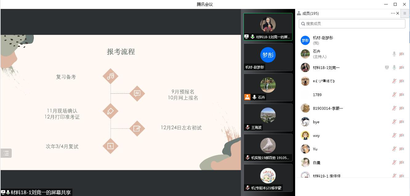 6月17日下午,机材学院在网上举行2023届考研动员大会。院长刘峰斌做考研动员,2名2022届考取研究生代表学生做交流发言,学院党委书记王文革作总结寄语。会议由党委副书记石卉主持,2023届全体考研学生、学院领导班子200余人参加本次活动。